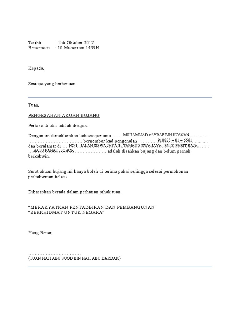 Borang akuan berkanun perakuan bujang atau tidak pernah berkahwin 12. ALIF BIN RIDUAN 840218-06- Dengan segala hormat dan sukacitanya perkara di atas adalah dirujuk. Padang luas 22000 jerteh terengganu.